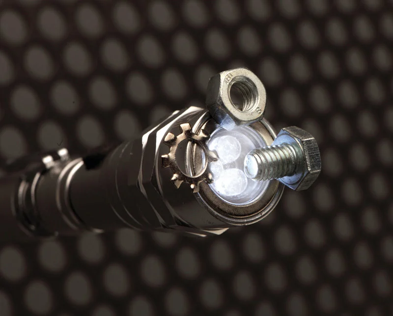 Nous connaissons tous cette situation : alors que nous bricolons, une petite vis nous échappe, roule sous l'armoire ou disparaßt dans un recoin inaccessible entre le cadre et le moteur de la moto. C'est alors que la lampe de poche magnétique à LED uniTEC avec télescope intégré (16,5 - 54,5 cm) sait se rendre utile.